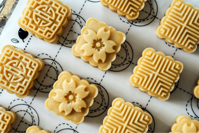 • 緑豆をペースト状にして乾燥させ、黄色っぽい生地に仕上げたもの。「糕(ガーオ)」という “ケーキ” 状の軽い焼菓子・菓子という位置付け。
