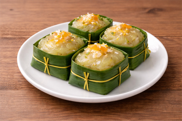 • 外側はもち米(または米粉)を使った生地で、中に緑豆(mung bean)ペーストを詰め、さらに箱型のパンダン葉(香りの強い葉)で包まれています。伝統的には婚礼の引き出物・お祝い菓子として用いられてきました。