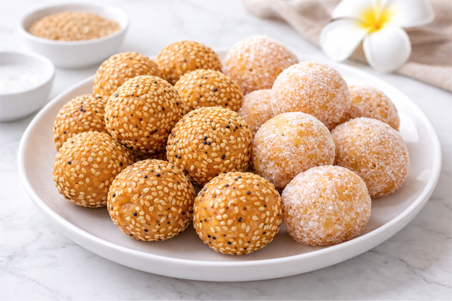 • 外側は小麦粉・餅粉・かぼちゃ・緑豆などを練って丸めたものを油で揚げ、白ごまをまぶすスタイル。中餡には緑豆ペースト+砂糖が入っています。